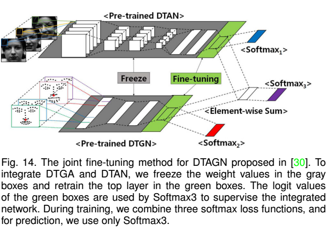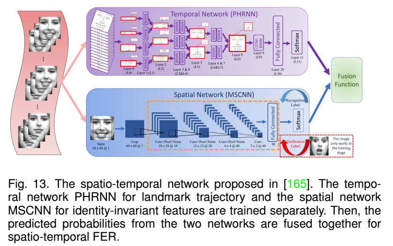 如两路CNN网络模型用于行为识别,一路用多帧数据的稠密光流训练获取时间信息,一路用于单帧图像特征学习,最后融合两路CNN的输出。还有多通道训练,如一通道用于自然脸和表情脸之间的光流信息训练,一路用于脸部表情特征训练,然后用三种融合策略,平均融合,基于SVM融合,基于DNN融合。也有基于PHRNN时间网络和MSCNN空间网络相结合来提取局部整体关系,几何变化以及静动态信息。除了融合,也有联合训练的,如DTAN和DTGN联合fineturn训练。