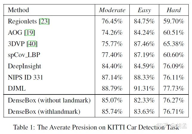 结果如table 1,即使是只做了部分landmark标注(27%),对比完全没有使用landmark标注,性能也有提升;作者认为KITTI上landmark多任务带来的性能提升没有MALF强,是因为KITTI上只标注了27%的车辆目标,标注量还不够,此外KITTI上只标注了8个landmark点,但MALF上标注了72个landmark点,可以发现DenseBox效果还是挺不错的,霸榜KITTI长达四个月的sota,后来才被其他算法超过;