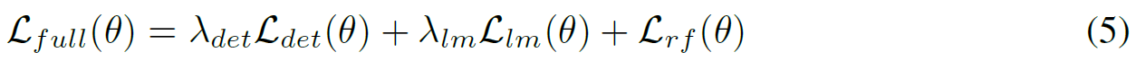 集合公式(4)、(5),可以发现:Ldet = Lcls + Lloc,Lfull = Ldet + Llm + Lrf,也即Lfull包含了四个loss分支,就是说同时学习四个任务;