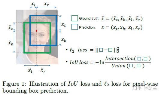 如果以上概念难以理解的话,配合UnitBox的这张图,就很容易理解了:红点即像素点(xi、yi),红点到bbox四个边界的距离即dx^t、dy^t、dx^b、dy^b;