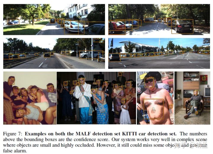 ImageNet上预训练的VGG19初始化,参与训练的patch中人脸尺度在50 pix 高左右,尺度随机resize至0.8 ~ 1.25倍;测试阶段:对图像做长边resize,确保图像长边不超过800 pix,然后就是图像金字塔操作,金字塔尺度为2^(-3) ~ 2^1.2,stride2^0.3,这样DenseBox可检出人脸尺度高度范围:20 pix ~ 400 pix,缺点就是,DenseBox上一张图像需要若干秒才能检出人脸;MALF上NMS的IoU阈值设置为0.5;