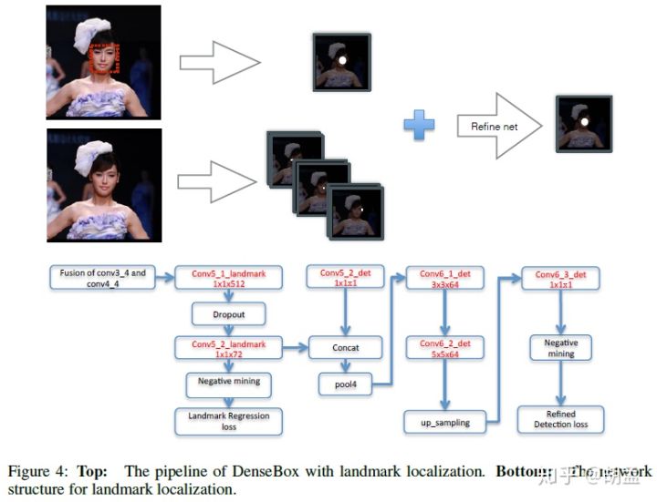 OverFeat不足是其在训练阶段,分类和定位任务仍然是分开训练的,且为了得到检测结果,还需要做复杂的后处理工作;DenseBox与OverFeat的不同之处在于:分类 + 检测 + landmark定位的多任务联合训练,且做到了end2end;