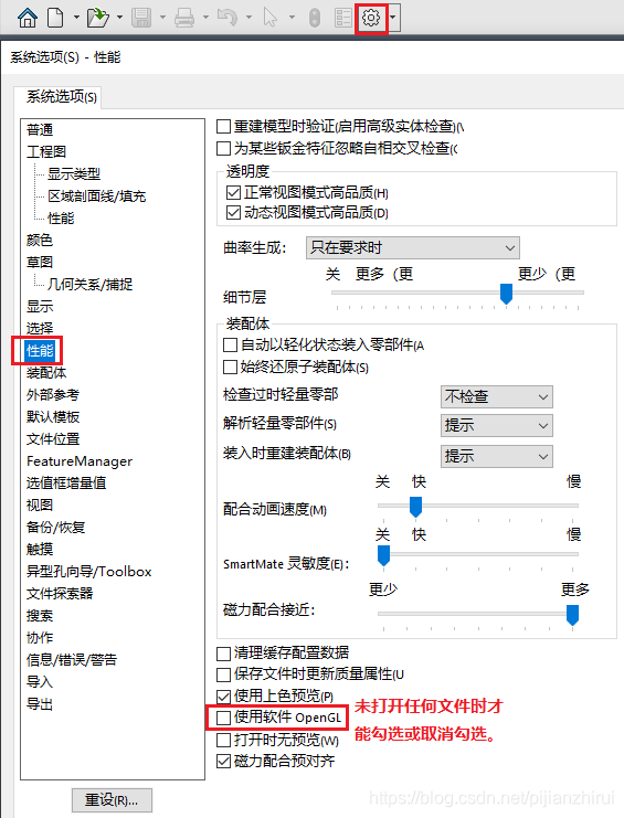 我推测是我所用的Solidworks 2018不支持过新的 AMD 显卡驱动(Radeon Software Adrenalin 2020 Edition 20.4.2)。另外,在系统选项的“性能”里面,勾选使用软件OpenGL,(此选项只能在没有打开任何文件的时候才能勾选或者取消勾选,勾选后将会由CPU负责显示图形,而不是由GPU显示),异常的片状物就会消失;取消勾选后,异常的片状物又会重新出现。这个现象可以反复重现,也基本能说明是Solidworks版本较低,不支持过新的显卡驱动。CPU毕竟不擅长做GPU的事情,勾选使用软件OpenGL之后,装配体的旋转、缩放、平移、选择面明显变得迟钝,很不好用。CPU只能勉强应付单个零件的显示,负担不起装配体。或许需要更换Solidworks 2020才能彻底解决这个问题。