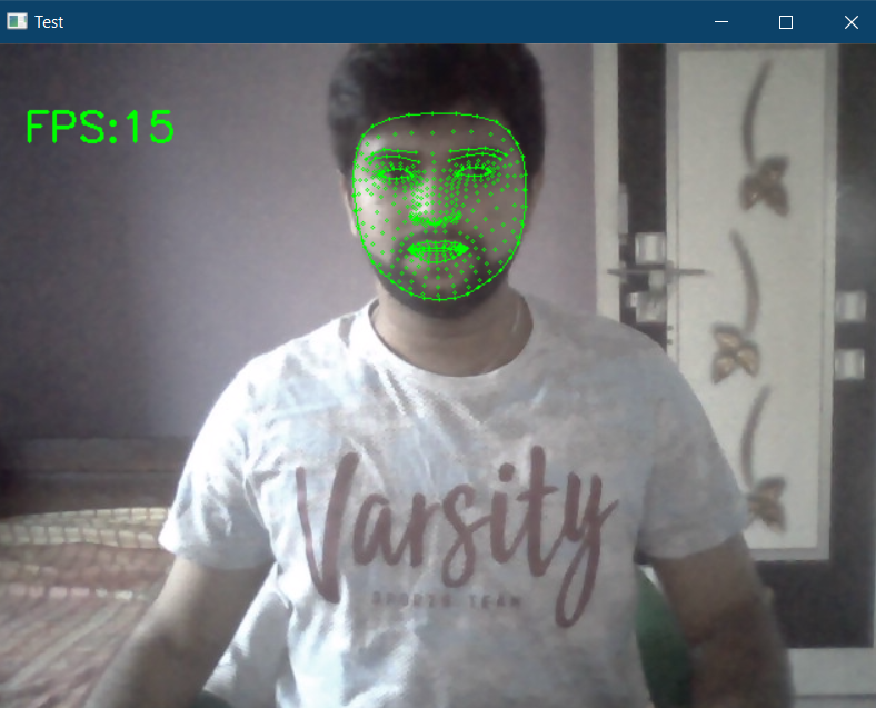 while True: success, img = cap.read() imgRGB = cv2.cvtColor(img, cv2.COLOR_BGR2RGB) results = faceMesh.process(imgRGB) if results.multi_face_landmarks: for faceLms in results.multi_face_landmarks: mpDraw.draw_landmarks(img, faceLms,mpFaceMesh.FACE_CONNECTIONS, drawSpec, drawSpec) for id,lm in enumerate(faceLms.landmark):print(lm)ih, iw, ic = img.shapex,y = int(lm.x*iw), int(lm.y*ih)# uncomment the below line to see the 468 facial landmark# cv2.putText(img, str(id), (x, y), cv2.FONT_HERSHEY_SIMPLEX, 0.3, (0, 255, 0), 1)print(id, x,y) cTime = time.time()fps = 1/(cTime-pTime)pTime = cTimecv2.putText(img, f'FPS:{int(fps)}', (20,70), cv2.FONT_HERSHEY_SIMPLEX, 1, (0,255,0), 2)cv2.imshow("Test", img)cv2.waitKey(1) 然后在 while 循环中读取帧并将帧转换为 RGB,将该图像传递给“ *faceMesh.process()”,*然后在面部绘制检测到的地标。