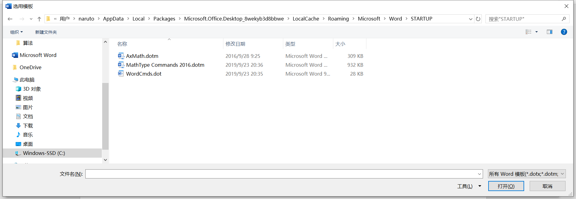 接着,在地址栏把路径选择到 Microsoft > Word > STARTUP,