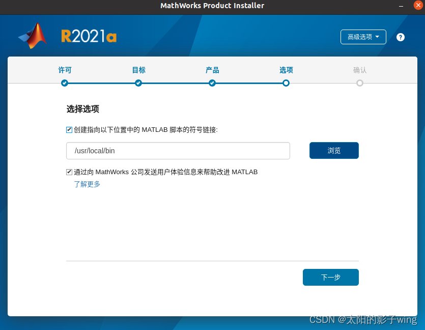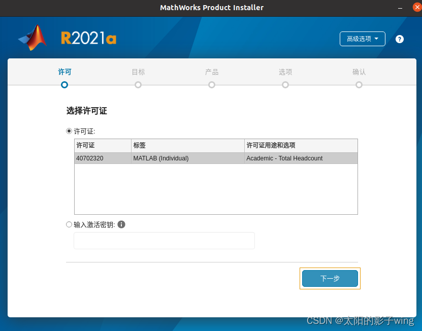 选中列表中已经自动关联的许可证,标签为“MATLAB (Individual)”,然后点击“下一步”。
