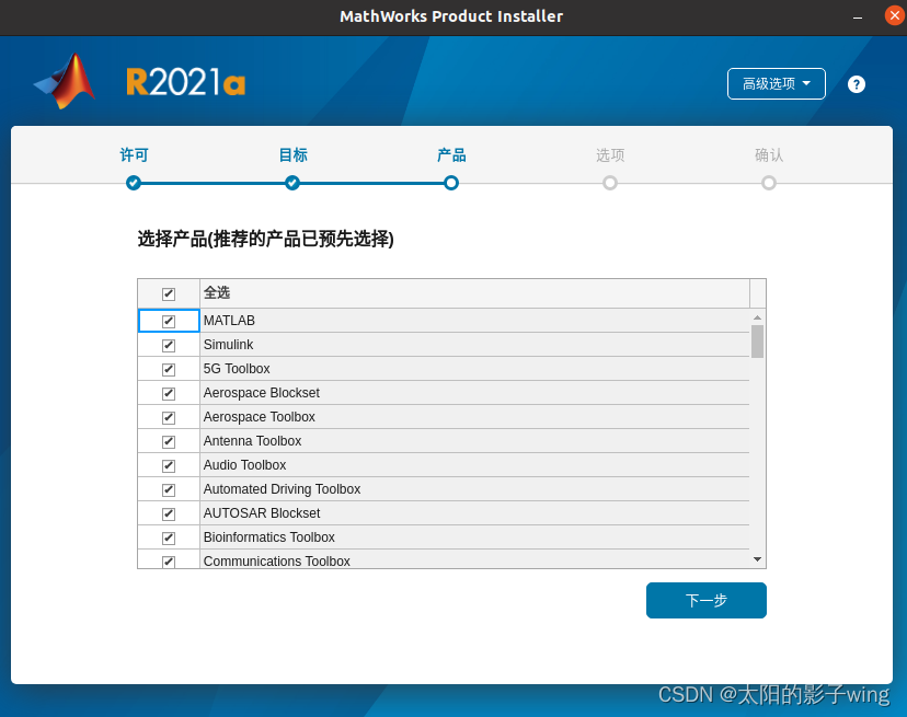 选择需要安装的产品及工具箱,也可以全选,然后点击“下一步”。