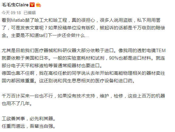 微博知名教育博主 @毛毛虫 Claire 也对哈工大和哈工程被禁用 MATLAB 一事发表评论。她指出,虽然私下可以使用盗版,但如果发表论文时投稿单位没有获得授权即使用 MATLAB 生成的数据、图、表等,则可能面临被起诉的风险。