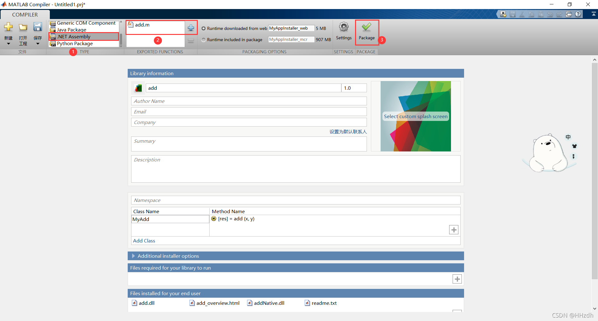 function res = add(x,y)res = x+y;end2、在命令行输入deploytool命令,打开Compiler,选择Library Compiler选项。