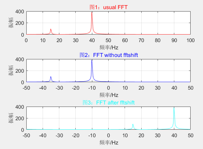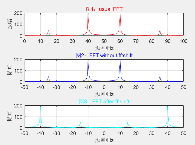 | 1 2 3 4 5 6 7 8 9 10 11 12 13 14 15 16 17 18 19 20 21 22 23 24 25 26 | close all; clear; clf; fs=100;N=256; %采样频率和数据点数 n=0:N-1;t=n/fs; %时间序列 x=0.5*exp(j*2*pi*15*t)+2*exp(j*2*pi*40*t); %信号 y1=fft(x,N); %对信号进行快速Fourier变换 y2=fftshift(y1); mag1=abs(y1); %求得Fourier变换后的振幅 mag2=abs(y2); f1=n*fs/N; %频率序列 f2=n*fs/N-fs/2; subplot(3,1,1),plot(f1,mag1,'r'); %绘出随频率变化的振幅 xlabel('频率/Hz'); ylabel('振幅');title('图1:usual FFT','color','r');grid on; subplot(3,1,2),plot(f2,mag1,'b'); %绘出随频率变化的振幅 xlabel('频率/Hz'); ylabel('振幅');title('图2:FFT without fftshift','color','b');grid on; subplot(3,1,3),plot(f2,mag2,'c'); %绘出随频率变化的振幅 xlabel('频率/Hz'); ylabel('振幅');title('图3:FFT after fftshift','color','c');grid on; |