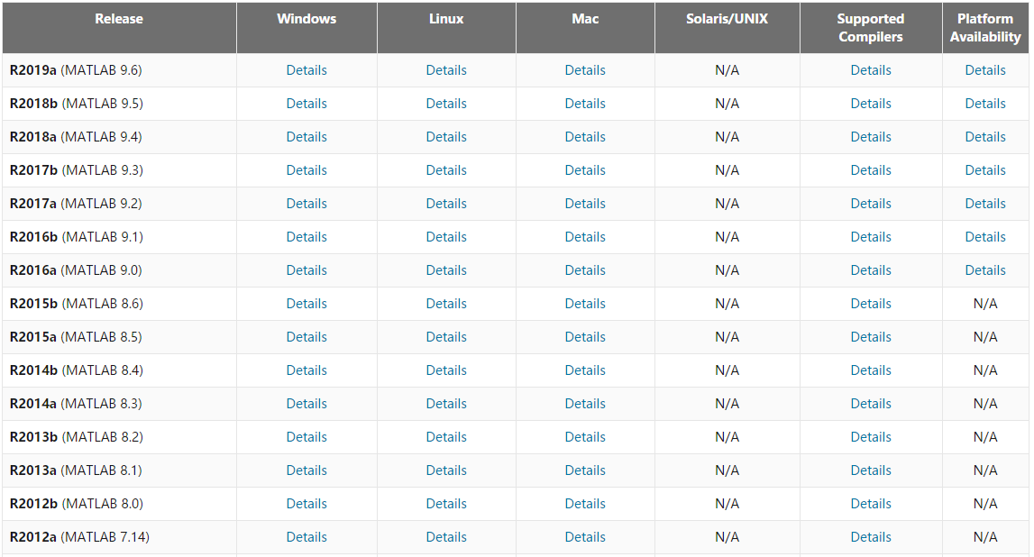 而对于支持的编译器,mathworks公司有一个详尽的支持表单,通过访问https://ww2.mathworks.cn/support/requirements/previous-releases.html可以得到: