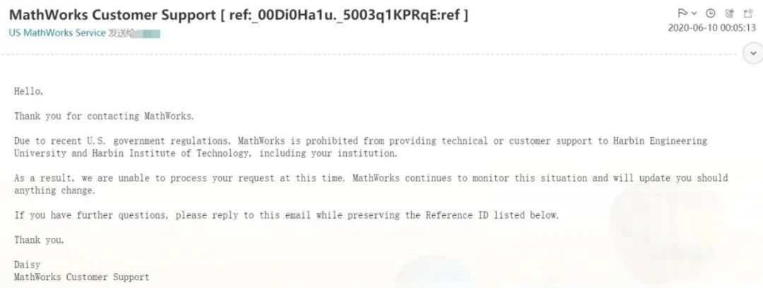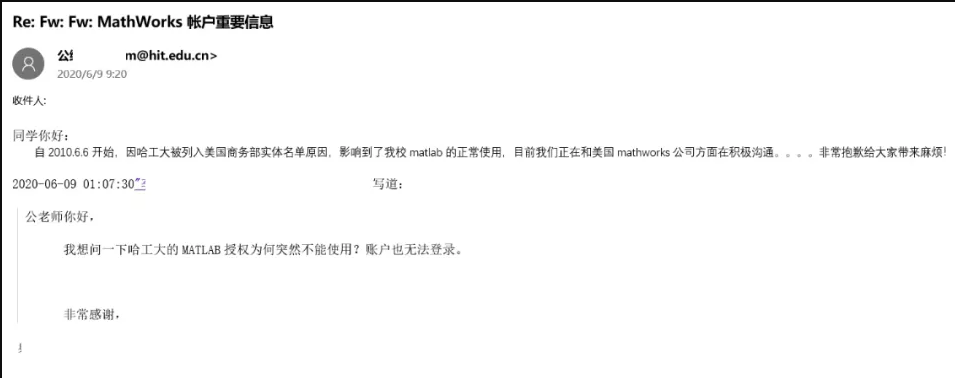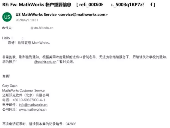 最近有哈工大学生表示 MathWorks 正版软件无法正常使用。与 MathWorks 客服交涉,对方告知“受近期美国政府规定的影响,公司已被要求禁止向哈工大/哈工程提供技术或客户支持”。