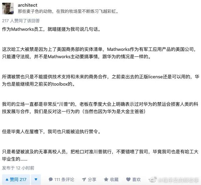 有自称 MathWorks 员工的网友在知乎上补充表示,“所谓被禁也只是不能提供技术支持和未来的商务合作,之前卖出去的正版 license 还是可以用的……”