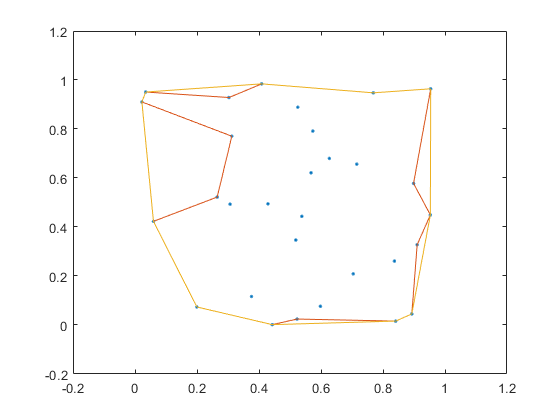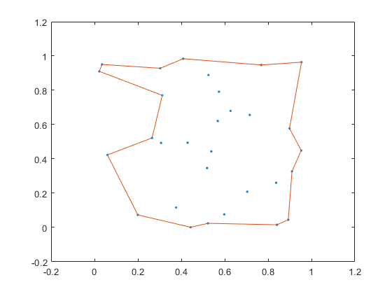 j = boundary(x,y,0.1); %这个函数是求一堆(平面)点的边界,它不是凸包,这里的边界可以凹陷,第三个参数0.1代表以松散的形式画出边界,1是以最紧凑的形式画出边界。