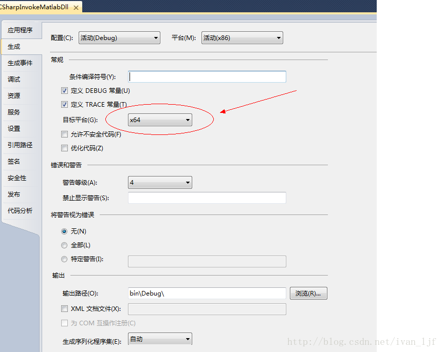 using System;using System.Collections.Generic;using System.ComponentModel;using System.Data;using System.Drawing;using System.Linq;using System.Text;using System.Windows.Forms;using MathWorks.MATLAB.NET.Utility;using MathWorks.MATLAB.NET.Arrays;using LJF; namespace CSharpInvokeMatlabDll{ public partial class Form1 : Form { public Array mm; public Form1() { InitializeComponent(); int[] x = { 0, 10, 20, 30, 40, 50, 60, 70, 80, 90, 100, 110, 120, 130, 140, 150, 160, 170, 180, 190, 200, 210, 220, 230, 240, 250, 255 }; int[] y = { 34, 35, 36, 37, 38, 40, 43, 45, 48, 52, 58, 66, 74, 83, 92, 105, 115, 129, 149, 168, 185, 198, 212, 220, 223, 224, 224 };//27 int[] p = new int[255]; for (int i = 0; i < 255;i++ ) { p[i] = i; } int n = 6; invgamma_Class mygam = new invgamma_Class(); MWArray ResultOut = null; ResultOut = mygam.invgamma((MWNumericArray)x, (MWNumericArray)y, (MWNumericArray)p, (MWNumericArray)n); MWNumericArray temp = (MWNumericArray)ResultOut; mm = temp.ToArray(MWArrayComponent.Real); } private void button1_Click(object sender, EventArgs e) { int qq = Convert.ToInt16(textBox1.Text); if (qq<255&&qq>=0) { int pp = Convert.ToInt16(mm.GetValue(0, qq)); textBox2.Text = pp.ToString(); } else { MessageBox.Show("data error"); } } }}注意要将CSharp工程的目标平台设置为64位。