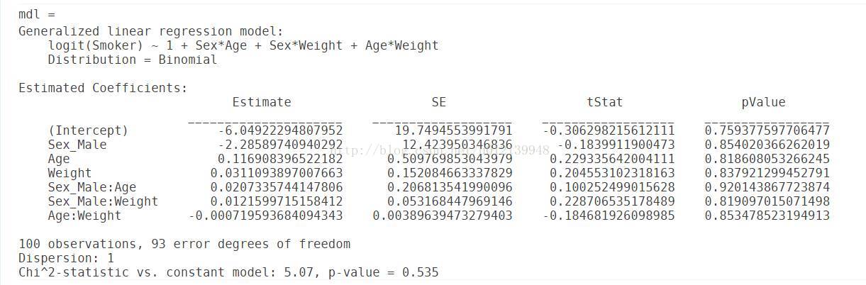 % 判定不同体重、年龄和性别的人的吸烟概率 load hospital dsa = hospital; % 指定模型使用的计算公式 % 公式的书写方式符合 Wilkinson Notation, 详情请查看: % http://cn.mathworks.com/help/stats/wilkinson-notation.html modelspec = 'Smoker ~ 1+ Age + Weight + Sex + Age:Weight + Age:Sex + Weight:Sex'; % 通过参数 ’Disribution' 指定 ‘binomial' 构建逻辑回归模型 mdl = fitglm(dsa, modelspec, 'Distribution', 'binomial')