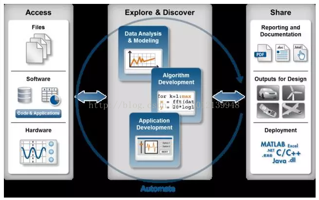 现在抛开 MATLAB,我们来看对于一个科学计算问题,一个典型的处理流程是怎样的。一个典型科学计算的流程如图 2 所示,即获取数据,数据探索和建模,最后是将结果分享出去。