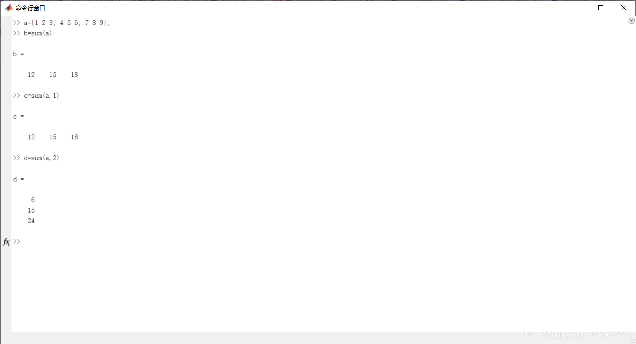 b=sum(a,dim); a表示矩阵;dim等于1或者2,1表示每一列进行求和,2表示每一行进行求和;表示每列求和还是每行求和;b表示求得的行向量。