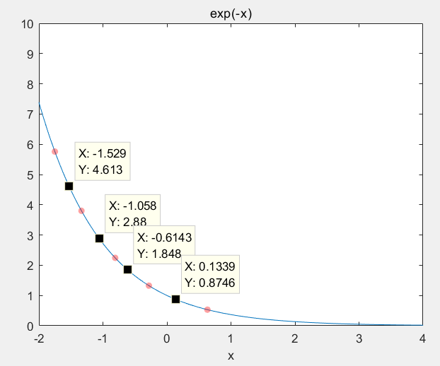 ezplot('exp(- x )',[-2,4,0,10])