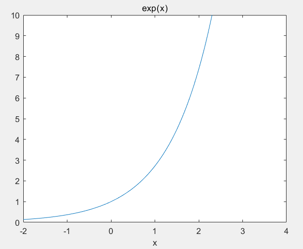 ezplot('exp(x)',[-2,4,0,10])