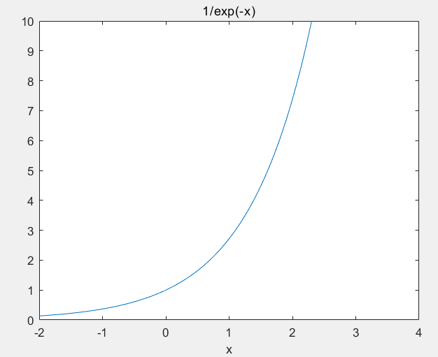 ezplot('1/exp(-x)',[-2,4,0,10])
