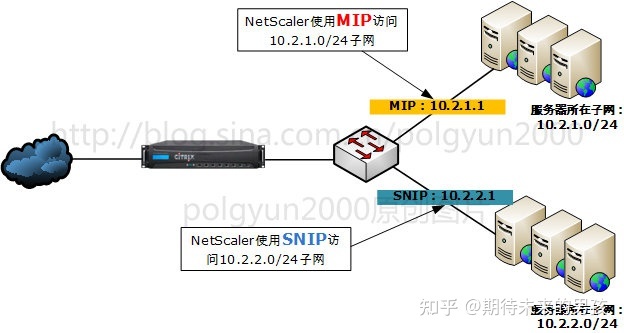 当NetScaler连接至多个子网,如果NetScaler MIP和后端服务器处于同一个子网的时候,则NetScaler使用MIP访问后端的10.2.1.0/24这个子网的Real Server。但是,当再增加一个子网10.2.2.0/24的时候,NetScaler与后端的10.2.2.0/24子网没有路由,MIP就无法与新增的子网通讯,这时就需要在NetScaler上增加一个与新增子网同一段的Subnet IP- 10.2.2.1,系统会自动将这个路由添加到路由表中,每增加一个子网都需要增加一个SNIP,这样NetScaler就可以使用SNIP来访问后端服务器了。