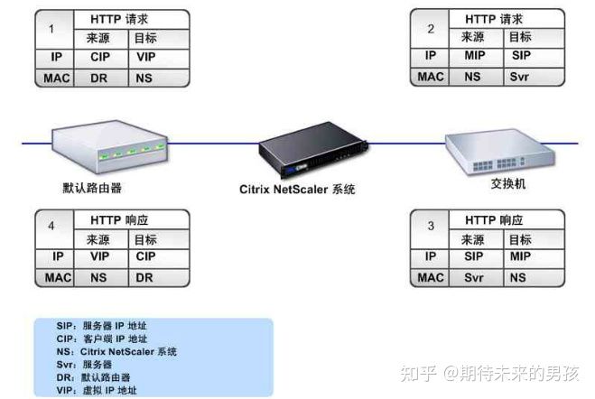 MIP: 映射IP,MIP用于NetScaler本身访问后端服务器使用。因为NetScaler的工作模式通常是部署在服务器群的前面,做为客户端和后端服务器之间的透明TCP代理,这个操作模式称为"请求交换技术",是NetScaler功能的核心。当NetScaler做为TCP代理的时候,它会把客户机发过来的请求切断,然后自己建立一个TCP连接到后端的Real Server,当后端Real Server处理完毕以后再返回给NetScaler,然后NetScaler再返回结果给用户。这个过程中,NetScaler会使用MIP做为向后端Real Server请求的源地址。看下图会比较容易理解一些: