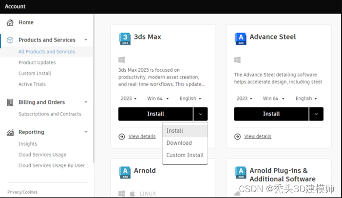 自定义安装:此方法由 Autodesk Account 中“产品和服务”下的“自定义安装”工具提供,用于在单台计算机上安装具有自定义设置的产品或在多台计算机上创建自定义部署。在下载之前,您可以在 Autodesk Account 中选择产品并指定安装设置。