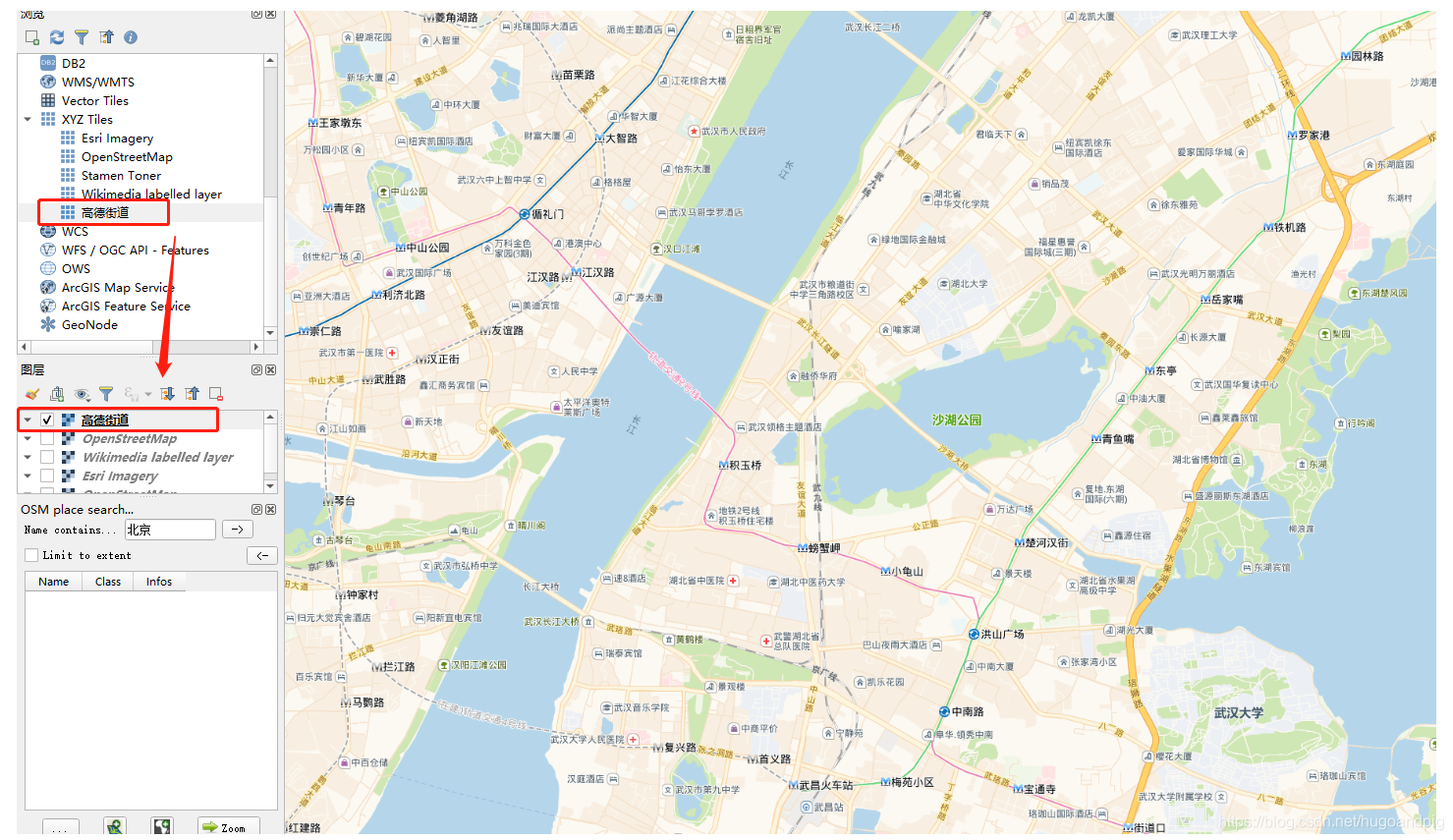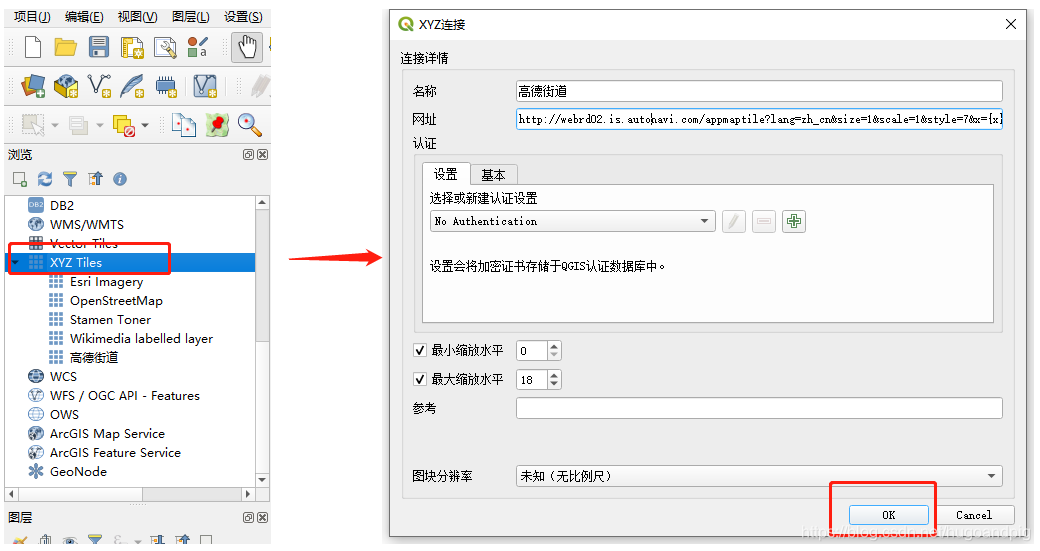 1. 在QGIS左侧的浏览面板中,选择XYZ Tiles节点,右键新建连接。在弹出的窗口中填入名称和瓦片地图的网址http://webrd02.is.autonavi.com/appmaptile?lang=zh_cn&size=1&scale=1&style=7&x={x}&y={y}&z={z} ,保存。