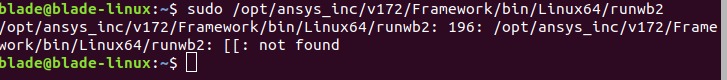 blade@blade-linux:~$ sudo /opt/ansys_inc/v172/Framework/bin/Linux64/runwb2 /opt/ansys_inc/v172/Framework/bin/Linux64/runwb2: 196: /opt/ansys_inc/v172/Framework/bin/Linux64/runwb2: [[: not found