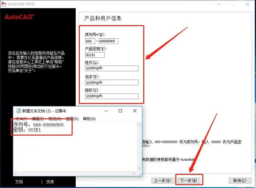6、输入序列号:666-69696969,密钥输入:001B1,姓氏随便输入(我输入微信公众号:yyrjmgzh),输入完后点击【下一步】。