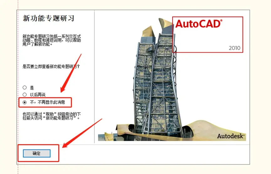 23、取消勾选【下次启动时提醒我】,然后点击【启动AutoCAD 2010】。
