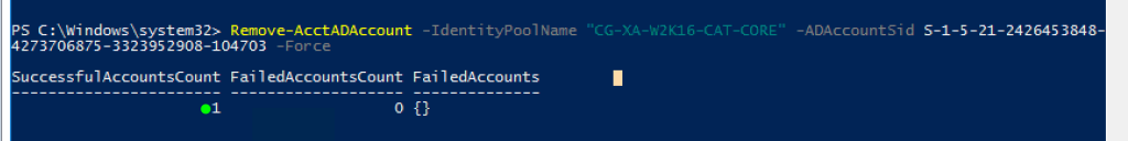 Remove-AcctADAccount -IdentityPoolName“ CG-XA-W2K16-CAT-CORE” -ADAccountSid S-1-5-21-450229160-670693645-933778194-1675 -Force
