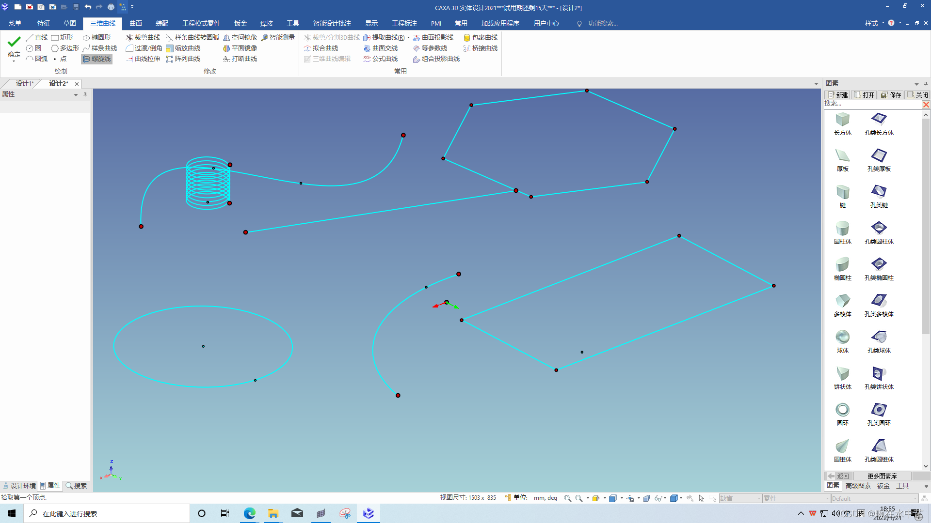 3. 点击三维曲线按钮,点击后绘制 面板 中的按钮可点击,鼠标点击要绘制的三维曲线,直接在设计环境中绘制即可。点击鼠标右键,一个曲线即绘制结束。