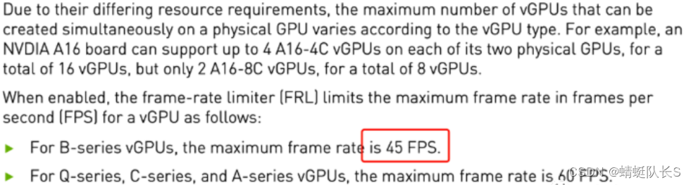 最近在一些项目中发现部分简单的3D场景,对显存要求不高(2G以内),vPC许可也能满足小图纸的使用需求。但在测试过程中用户发现帧率仅能达到45帧,从Nvidia官方文档也能看到45帧限制说明: