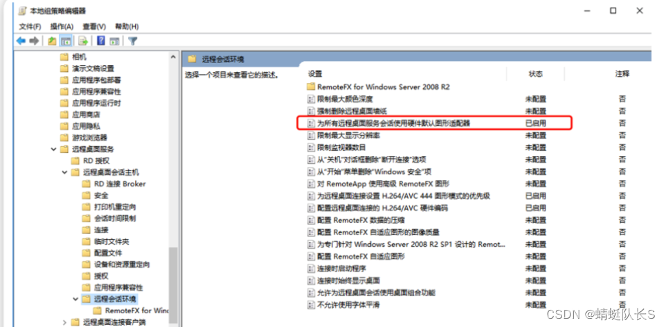本地计算机策略>计算机配置 > 管理模板 > Windows 组件 > 远程桌面服务 > 远程桌面会话主机 > 远程会话环境中的对所有远程桌面服务会话使用硬件默认图形适配器设置。