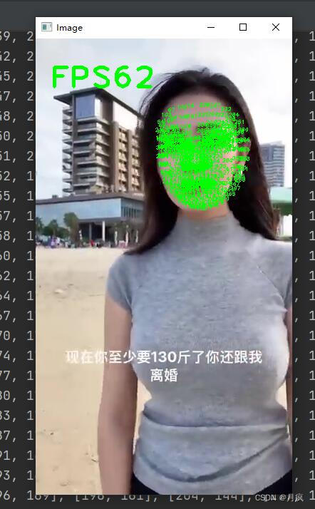 import cv2import mediapipe as mpimport time class FaceMeshDetector(): def __init__(self,staticMode=False,maxFaces=2,minDetectionCon=0.5,minTrackCon=0.5): self.staticMode = staticMode self.maxFaces = maxFaces self.minDetectionCon = minDetectionCon self.minTrackCon = minTrackCon self.mpDraw = mp.solutions.drawing_utils self.mpFaceMesh = mp.solutions.face_mesh self.faceMesh = self.mpFaceMesh.FaceMesh(self.staticMode,self.maxFaces,False,self.minDetectionCon,self.minTrackCon) # 一张脸显示 # 設置点的大小和半径 self.drawSpec = self.mpDraw.DrawingSpec(thickness=1, circle_radius=2) def findFaceMesh(self, img, draw=True): self.imgRGB = cv2.cvtColor(img, cv2.COLOR_BGR2RGB) self.results = self.faceMesh.process(self.imgRGB) faces = [] if self.results.multi_face_landmarks: for faceLms in self.results.multi_face_landmarks: if draw: self.mpDraw.draw_landmarks(img, faceLms, self.mpFaceMesh.FACEMESH_LEFT_EYEBROW, self.drawSpec, self.drawSpec) # 设置点的大小 face =[] for id,lm in enumerate(faceLms.landmark): # print(lm) ih, iw, ic = img.shape x, y = int(lm.x * iw), int(lm.y * ih) #绘制出坐标点的数字 cv2.putText(img, str(id), (x, y), cv2.FONT_HERSHEY_PLAIN, 0.5, (0, 255, 0), 1) face.append([x,y]) faces.append(face) return img,faces def main(): cap = cv2.VideoCapture("../videos/heng.mp4") pTime = 0 detector = FaceMeshDetector(maxFaces=2) while True: success, img = cap.read() img,faces = detector.findFaceMesh(img,False) #True表示绘制人脸,False表示不绘制人脸 if len(faces)!=0: print(faces[0]) cTime = time.time() fps = 1 / (cTime - pTime) pTime = cTime cv2.putText(img, f'FPS{int(fps)}', (20, 70), cv2.FONT_HERSHEY_PLAIN, 3, (0, 255, 0), 3) cv2.imshow("Image", img) cv2.waitKey(1) if __name__ == "__main__": main()效果: