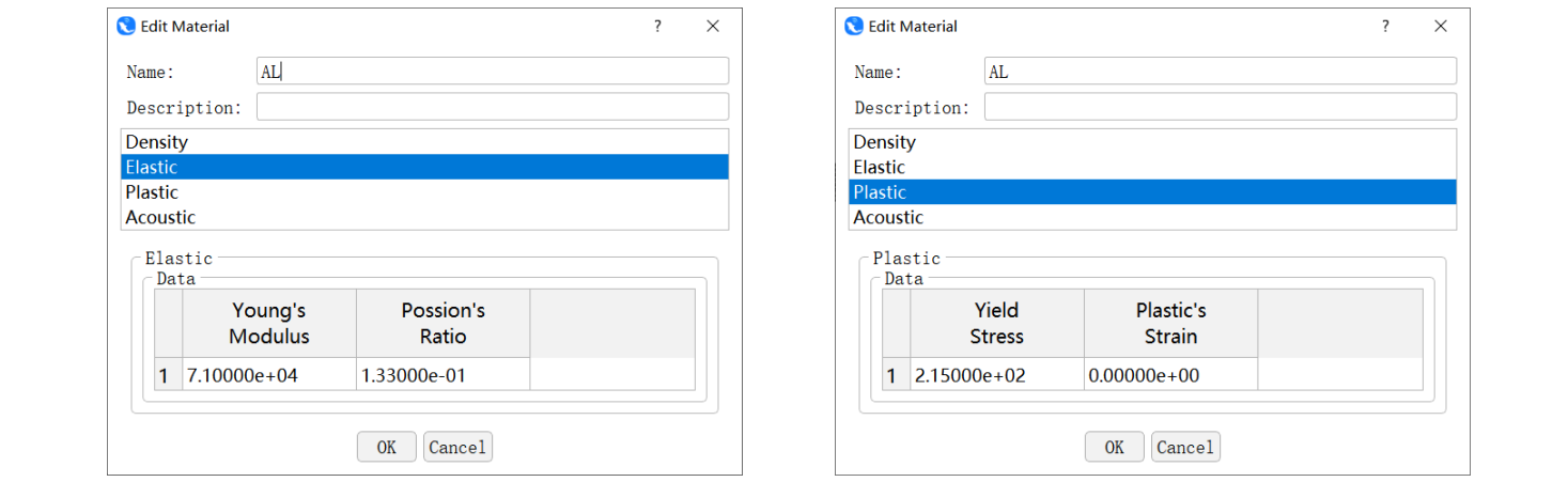 支座采用C3D8R单元模拟,螺栓采用梁单元模拟,梁单元半径为10mm,铝合金采用理想弹塑性本构,材料属性如下图所示: