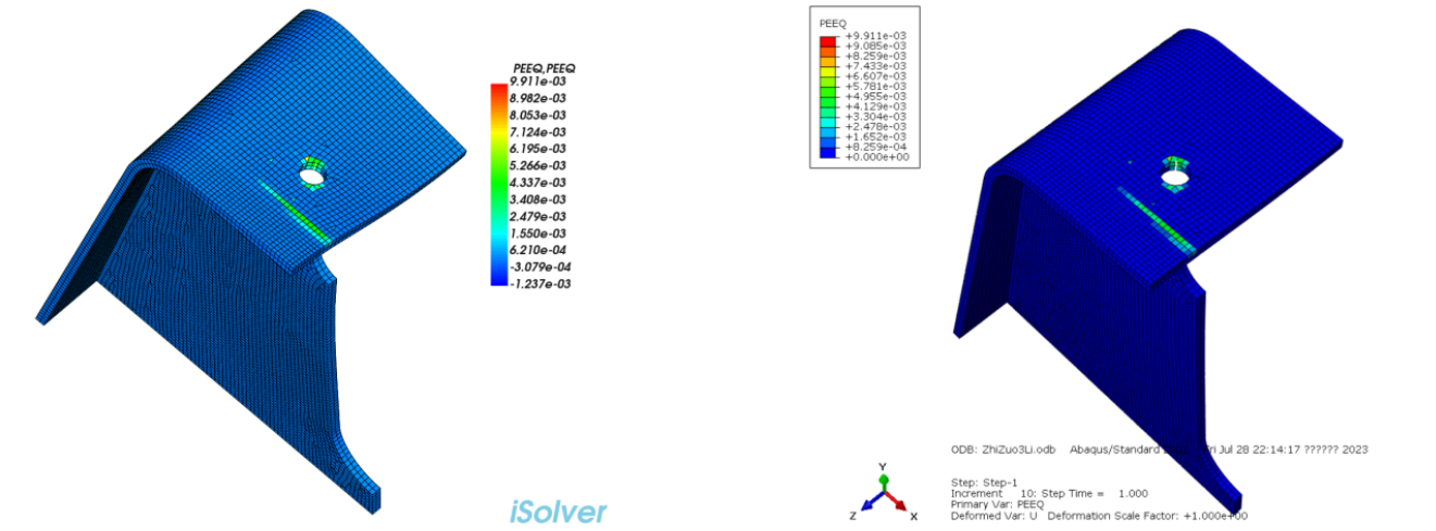 工况1下isolver与Abaqus的等效塑性应变云图如下所示: