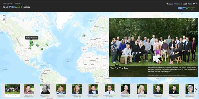 Esri的商业合作伙伴Pro-West&Associates公司也使用Story Map Tour模板来介绍他们的员工,各自的技能和兴趣。