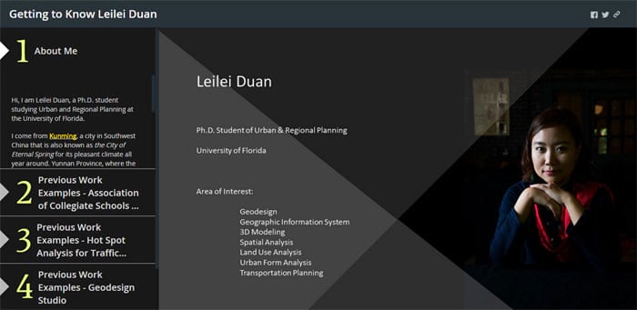 你可以使用故事地图制作一份 交互 式的简历来介绍自己。 下面这个是来自咱们中国云南省的段蕾蕾(Leilei Duan)童鞋使用 Story Map Series模板制作的一份简历,未来的雇主不仅可以通过这份交互式简历来了解她的基本信息,还可以通过交互式地图查看她的以往GIS工作。