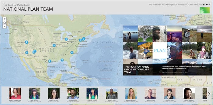 可以使用故事地图向你的客户或公众介绍你的员工,让他们知道你们是做什么的,通过这种方式可以更好地展示你公司的专业性和独特性。下面这个例子是国家公共土地信托机构使用Story Map Tour模板介绍其GIS团队,通过这个故事地图你可以直观地了解到每个成员来自何方、喜欢什么以及他们的角色及职责。