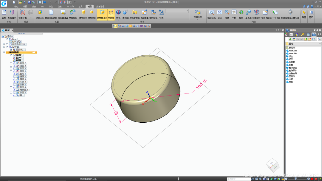 在浩辰3D设计软件的草图选项卡中,点选「草图绘制」,绘制出叶毂的外形轮廓草图,并约束相关的尺寸参数「直径100」,拉伸成型「高50」,倒圆数据「半径5」,如图所示。