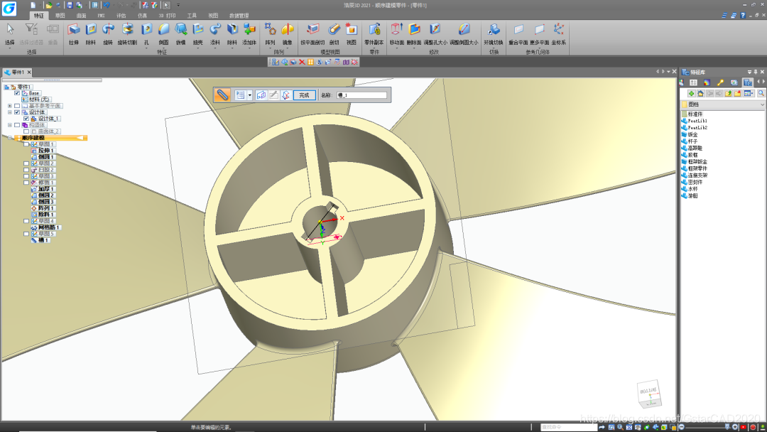 在浩辰3D设计软件的「特征」选项卡中,点选「添料」,并在下拉功能中,点选「加厚」命令—「对称加厚」。之后,通过「阵列」功能,即可实现扇叶成型,如图所示。