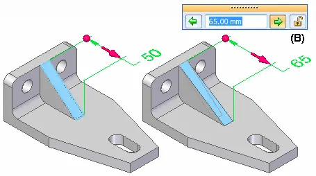 在模型上选择一个或多个面,然后使用方向盘 (A),按照您定义的方向和值 (B) 移动这个(些)面,同时保留相邻面或特征的大小和位置关系。