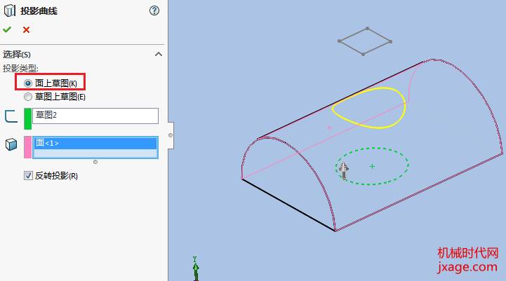 1.点击【投影曲线】,类型选择【面上的草图】,选择要投影的草图和投影面,确定好方向,点击勾号完成。