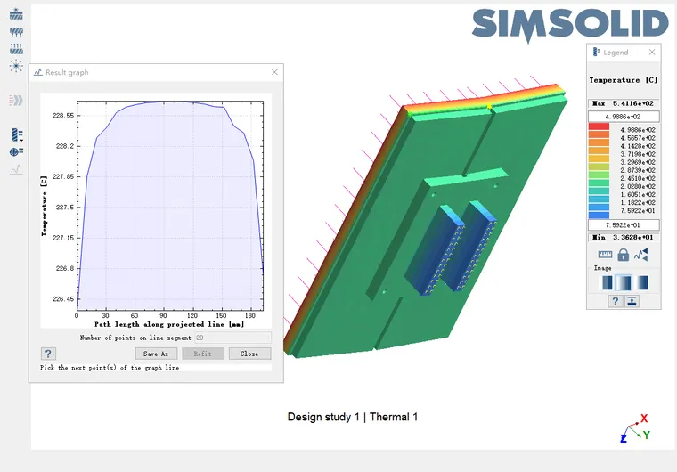 经过短时间的分析(大约20秒),就得到分析结果,将分析结果提取温度,如图5所示,石墨最高温度低于500℃,与其最高工作温度(>1000℃)相差较远,即整个结构均在正常工作温度范围内,该结构能够较好的指导我们的设计成果。左图折线图为石墨与不锈钢交界面(热阻设置面)的温度点选直线上的温度变化曲线。可以得到其温度大约为220℃左右,与实验真实结果(该处温度约为200℃,接触热阻影响下换热系数约为10444W/m2*K)能较好的吻合,但仍然有一定的误差计算,这可能是由于1)本模型是一个简化的优化模型,并不能将细节部分进行模型计算;2)与真空室焊接面的温度会随着其主动冷却系统的冷却情况发生变化,而本case直接设置为35℃的恒温可能会引起一定的误差。