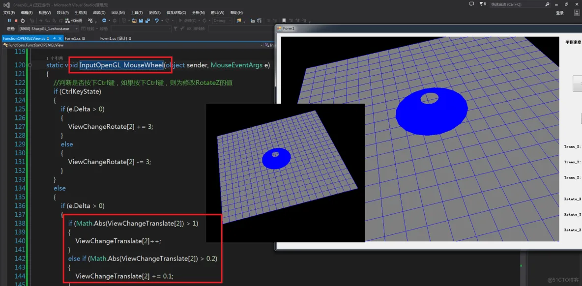 讲到缩放视图,最方便的是用鼠标滚轮实现,鼠标滚轮上滚和下滚,e.Delta数值是正的和负的,为了防止太大的时候缩放的太快,所以如果已经ViewChangeTranslate很小,就缩放的再慢一点(也可以做成一个函数,越远越小则缩放越快,这样更符合用户体验)绕Z轴旋转还是比较重要的,为了防止规则太多,我还是用鼠标滚轮实现(需要先按下Ctrl键),到这里基本的视图控制就完成了。
