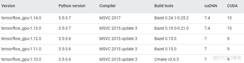 Tensorflow源码编译bug多一直被广大用户诟病,不同版本对应不同的编译器,gpu版本还需要安装对应的cuda和cudnn库。因此笔者强烈建议先到官网查看编译配置,具体点击下面链接:Build from source on Windows(https://tensorflow.google.cn/install/source_windows)下面列出前5个官方已经测试过的配置: