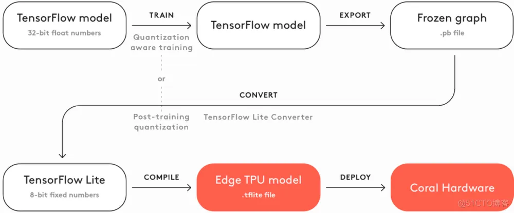 Coral 提供了一系列用于原型设计、生产和传感的硬件产品,其中一些本质上是增强型的树莓派,专为 AI 应用程序创建,能够利用 Edge TPU 在低功耗设备上进行高性能推理。Coral 还提供用于图像分割、姿态估计、语音识别等任务的预编译模型,为希望创建本地 AI 系统的开发人员提供支持。创建模型的基本步骤如下面的流程图所示。